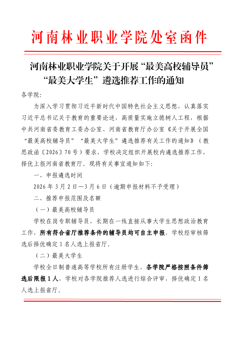 河南林业职业学院最美辅导员、最美大学生遴选通知