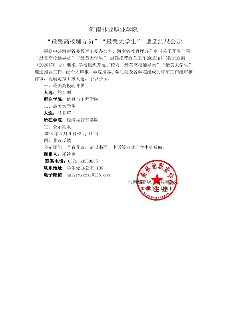 河南林业职业学院“最美高校辅导员”“最美大学生”遴选结果公示 作者:杨铁良 来源:学生处 发布时间:2026-03-09 18:40:32 浏览次数: 次 【字体:小 大】 终审:李继东 分享到: 【打印正文】