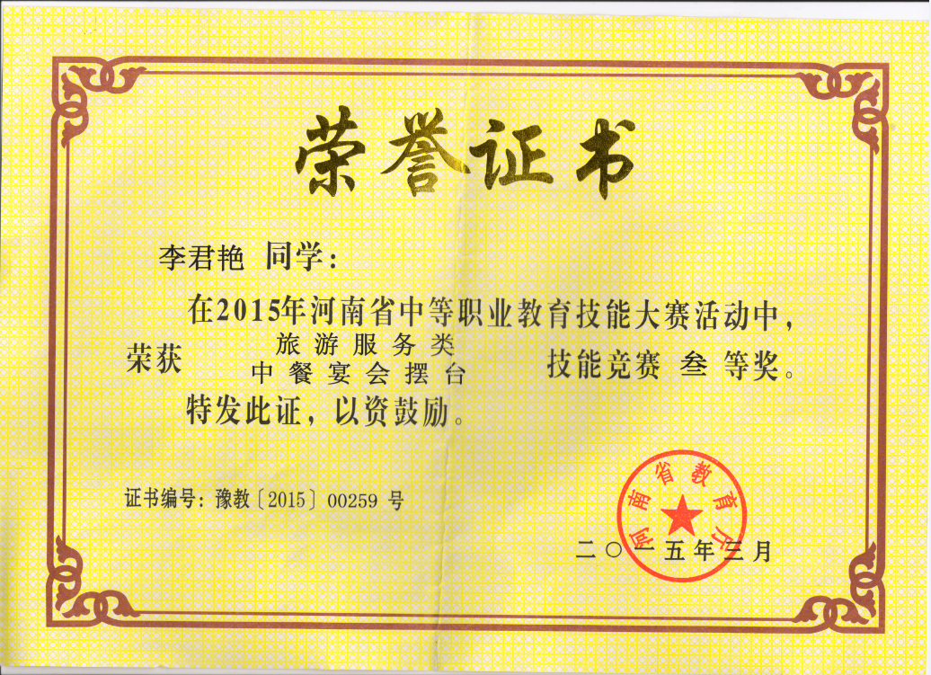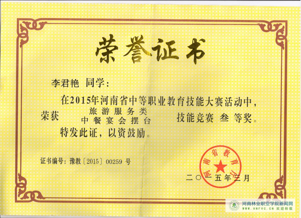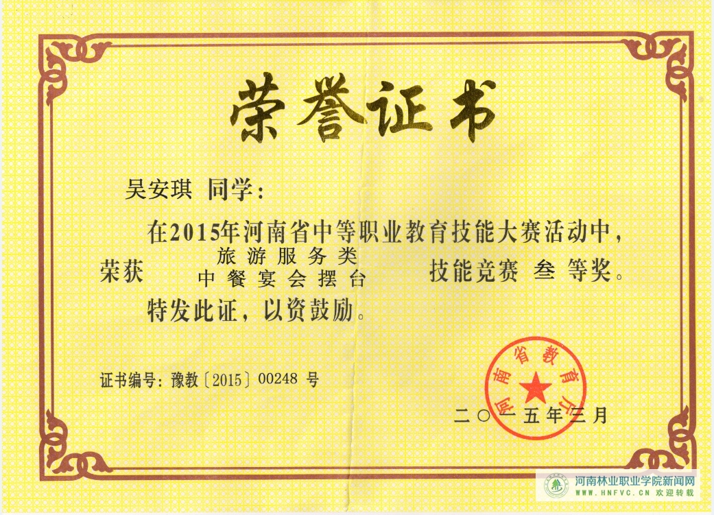 我院旅游专业学生参加河南省中等职业教育技能大赛获奖 作者:杨晓红 来源:生旅系 发布时间:2015-04-07 15:57:10 浏览次数: 次 【字体:小 大】 在3月20--21日河南省中等职业教育技能大赛中,生态工程与旅游系选派了四名优秀学生参加了中餐宴会摆台和客房中式铺床二个项目的比赛,其中中餐宴会摆台的吴安琪同学、李君艳同学喜获省级三等奖的好成绩。 此次技能大赛深得学院领导和系部领导的高度重视和支持,从寒假前就开始了认真的准备和培训,寒假期间也没间断训练,辅导教师杨晓红老师和张艳华老师,带领学生克服重重困难,认真备战,在系领导和系里其他老师的支持配合下,取得了较好的成绩,为学院争得了荣誉。 分享到: 【打印正文】
