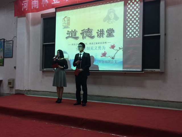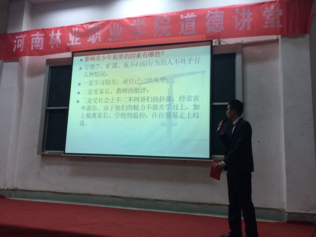 11月29日晚七点三十分,由河南林业职业学院主办、生态工程与旅游系承办的道德讲堂在学院西阶梯教室隆重举行,此次道德讲堂以“安全法制、见义勇为”主题,学院党办、各系部、团总支主要负责人及生旅系全体同学参加了此次活动。