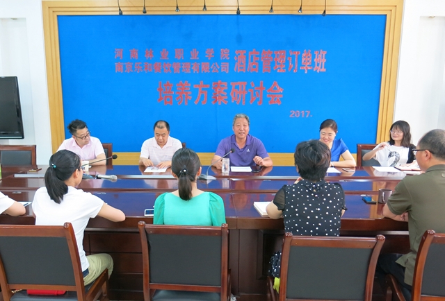 6月14日上午8:30,生态工程与旅游系与南京乐和餐饮管理有限公司在学院三会议室召开2017级酒店管理订单班人才培养方案研讨会。学院副院长路买林到会指导,南京乐和酒店副总刘梅、人事经理李乐、生态系主任王建及全体旅游教研室老师共同参与讨论。