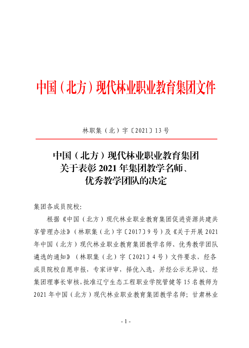 中国(北方)现代林业职业教育集团关于表彰2021年集团教学名师、优秀教学团队的决定