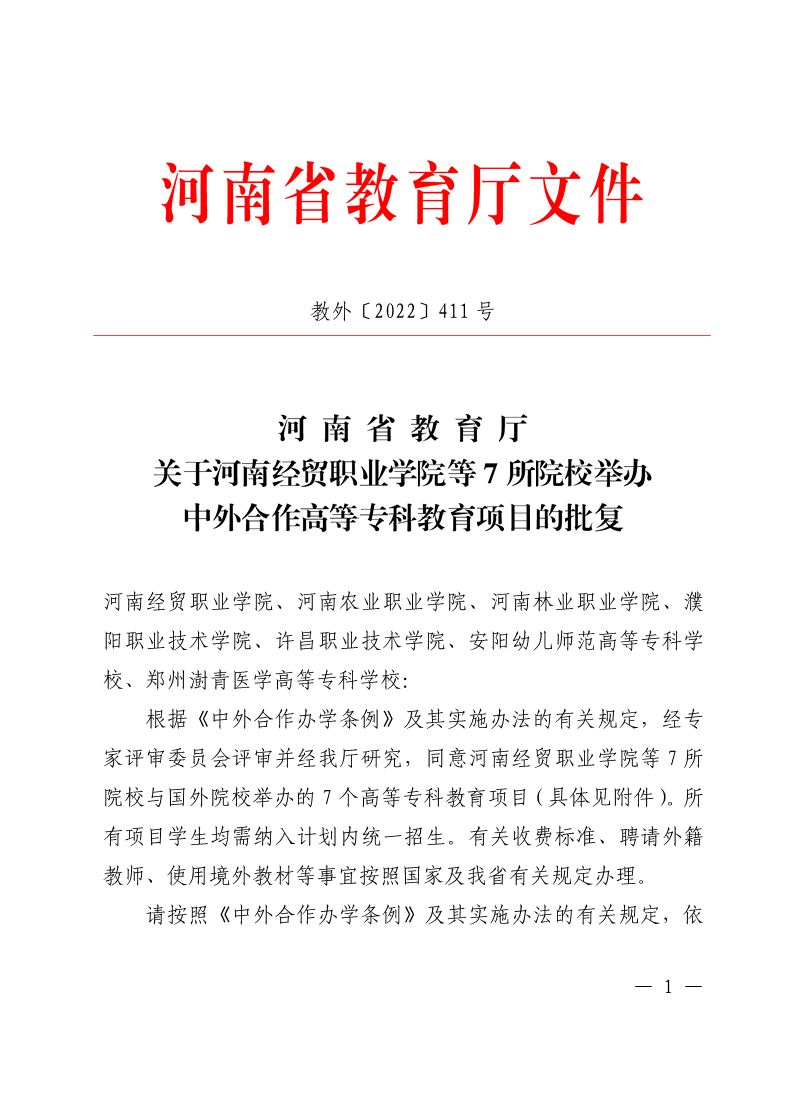 河南省教育厅关于河南经贸职业学院等7所院校举办中外合作高等专科教育项目的批复 作者:蒋永丛 来源:双高办 发布时间:2023-02-12 浏览次数: 次 【字体:小 大】 2_河南省教育厅关于河南经贸职业学院等7所院校举办中外合作高等专科教育项目的批复.pdf 分享到: 【打印正文】