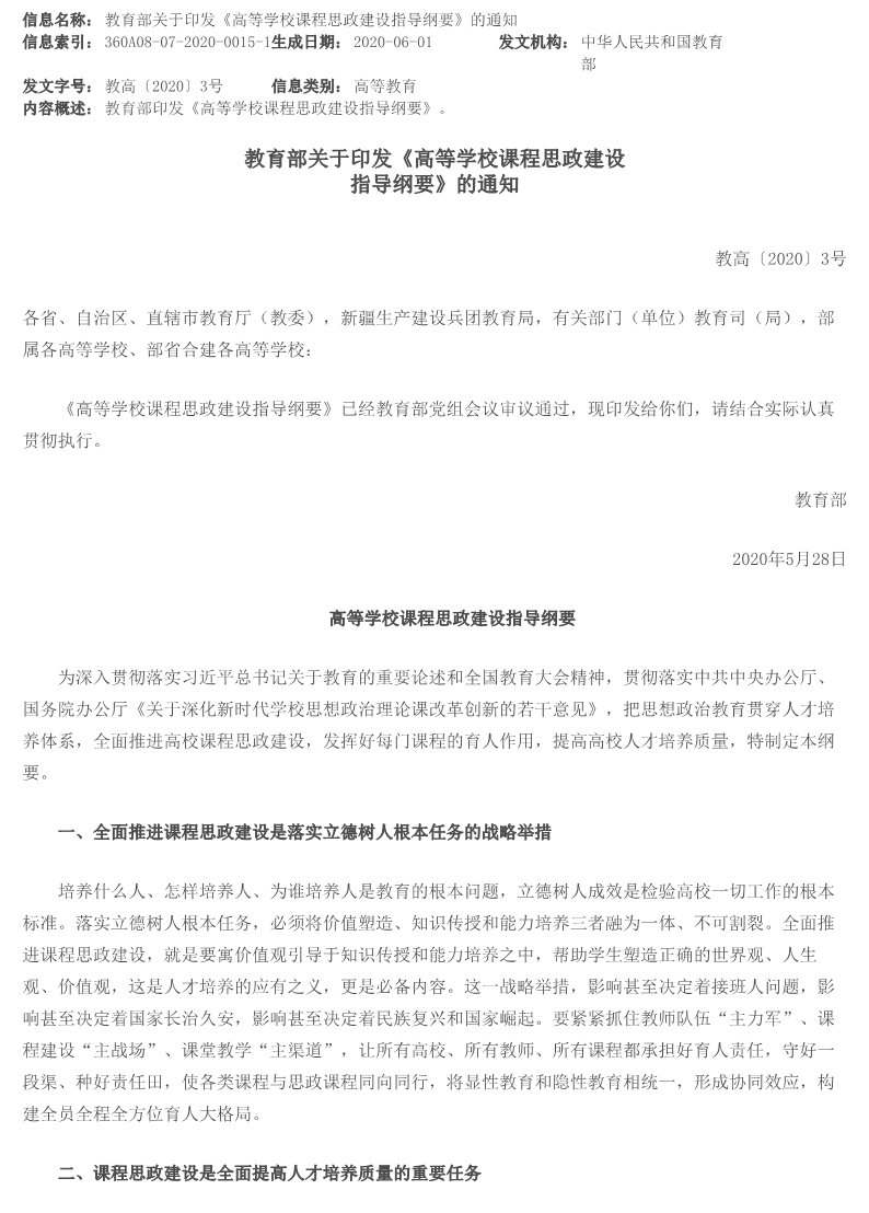 教育部关于印发《高等学校课程思政建设指导纲要》的通知