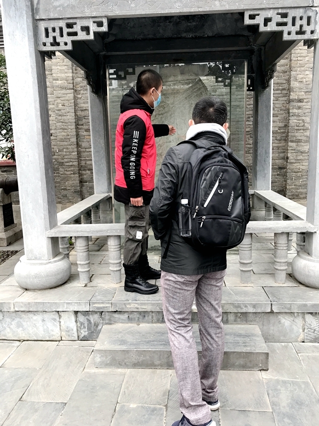 在庭院内,有一面饱经历史风霜的石碑,游客对上面字迹难以辨认的碑文很感兴趣,青马班学员主动上前介绍石碑来历、碑文内容、变迁过程等等,声情并茂的讲解让游客了解到了石碑的历史价值。