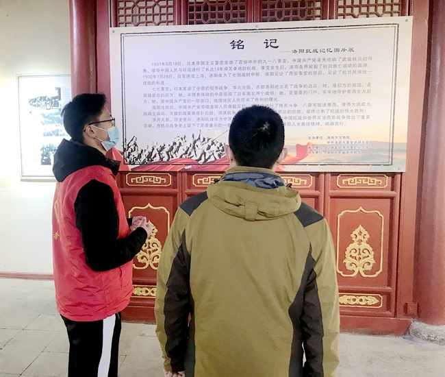 经过前期的系统培训,两位青马学员对洛八办展馆内容及有关抗日史料进行了充分的学习和模拟解说,他们当天身着红色志愿服,热情饱满地为前来参观的游客提供义务讲解服务。