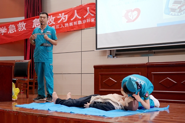 培训采取理论与实操相结合的方式,通过专家讲解、观看视频、实例举证和现场示范等,收到了较好的效果。第三人民医院急诊科的付战胜主任现场讲解了心肺复苏法、止血包扎、自动体外除颤仪、海克里姆等基本理论和实操要点,大家边学边记,随后分四组进行实操练习。在专家组医生们的手把手指导下,随着一次次的重复操练,同学们的操作手法逐渐规范、准确、娴熟。