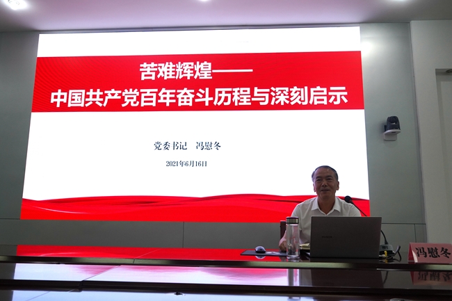 为推进我院党史学习教育走深走实,切实发挥好党员领导干部的引领表率作用,6月16日下午,学院党委书记冯慰冬以《苦难辉煌——中国共产党百年奋斗历程与深刻启示》为题,在办公楼三会议室为思政课教师和青马班学员讲授了一堂精彩生动的党课。