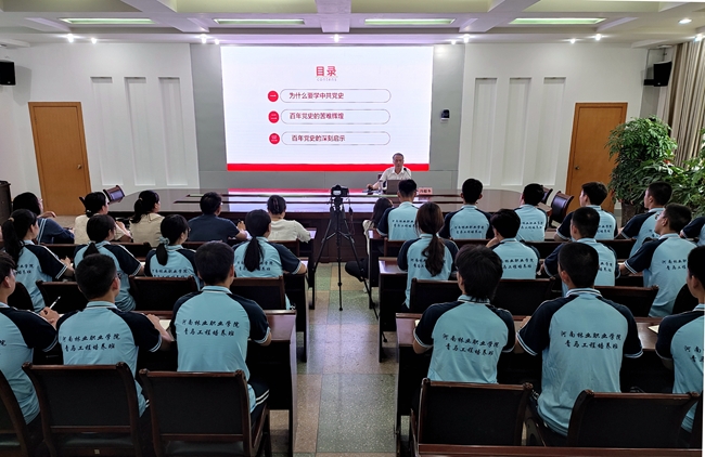 冯慰冬从为什么要学中共党史、百年党史的苦难辉煌、百年党史的深刻启示三部分展开授课,详细讲述了我们党从新民主主义革命、社会主义革命和建设、改革开放新时期到中国特色社会主义新时代四个阶段的奋斗历程;例举了党史上坚定理想信念的典范,结合革命故事,生动展示了遍布在党史画卷中可歌可泣的英雄人物。一组组详实的数据、一桩桩真实的事例、一个个深刻的启示,冯书记系统生动的讲解,给师生们展开了一幅中国共产党带领全国人民从站起来、富起来到强起来的壮美历史画卷。