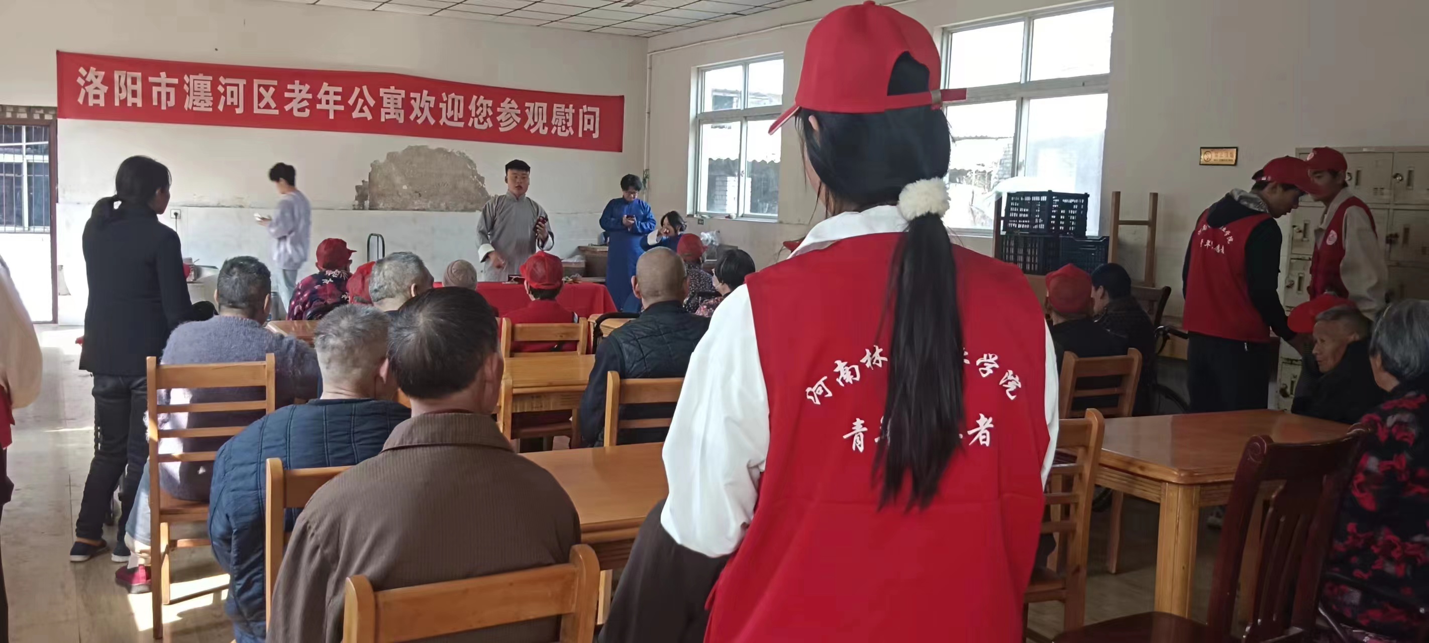 为传承和弘扬雷锋精神,弘扬中华民族敬老爱老的传统美德,倡导文明新风,4月1日,院团委组织青年志愿者大队、大学生艺术团曲苑社和相声文艺社团到瀍河区敬老院开展“让公益爱心走进敬老院”敬老爱老志愿服务活动。