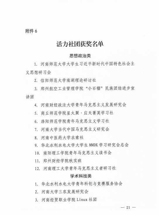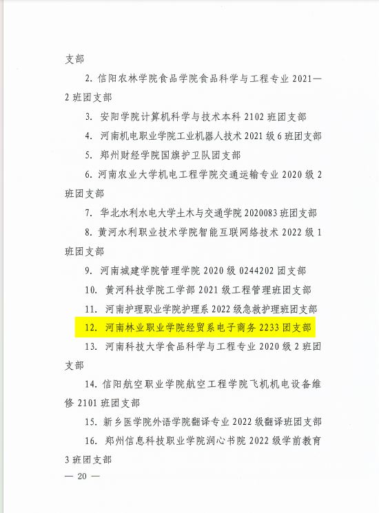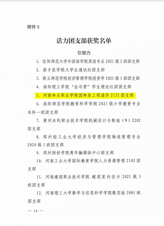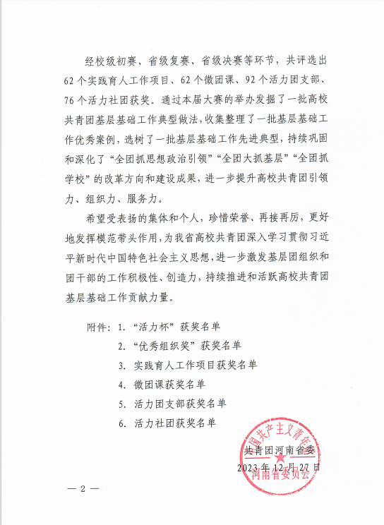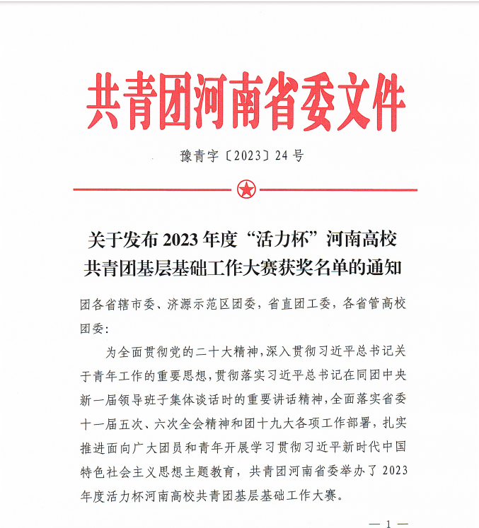 近日,共青团河南省委印发了《关于发布2023年度“活力杯”河南高校共青团基层基础工作大赛获奖名单的通知》(豫青字 〔2023〕24号),我校园林系工程造价2131团支部、经贸系电商2233团支部分别在引领力和好作风专项中荣获全省“活力团支部”荣誉称号;黑科技社团荣获全省“活力社团”荣誉称号。