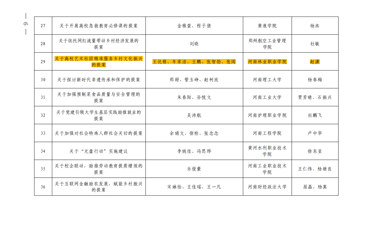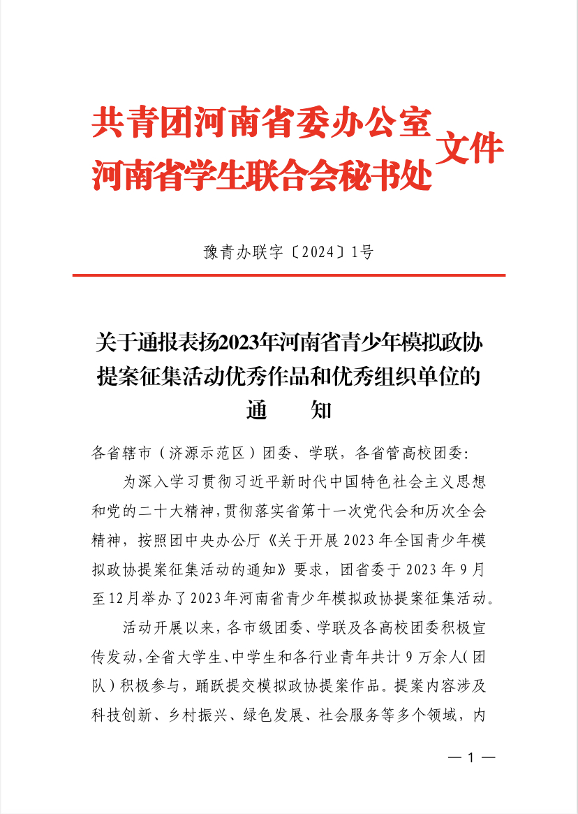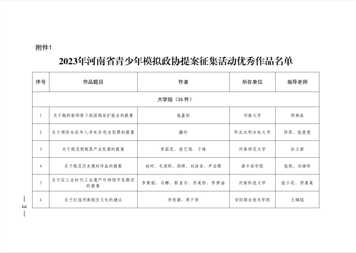 近日,团省委发布《关于通报表扬2023年河南省青少年模拟政协提案征集活动优秀作品和优秀组织单位的通知》,由我校赵潇老师指导,王优雅、车家洁、王鹏、张智勃、张闯五名同学参与完成的《关于高校艺术类社团精准服务乡村文化振兴的提案》作品榜上有名!