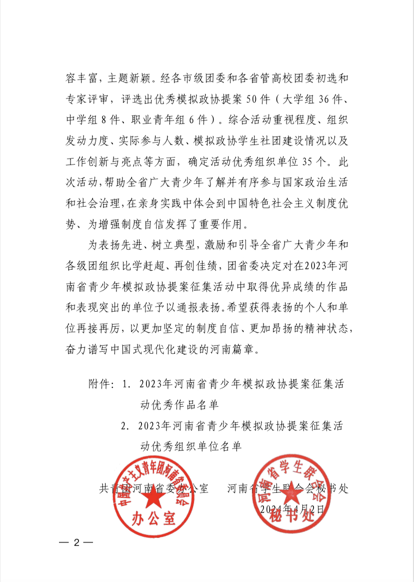 自2023年河南省青少年模拟政协提案征集活动启动以来,校团委积极组织学生报名参加,接触社会、体察生活、深入群众,关心社会经济发展,关注民生实事,共提交作品15份,提案数量再创新高,有力发挥了我校共青团桥梁纽带作用,体现了我校青年学子的责任担当。