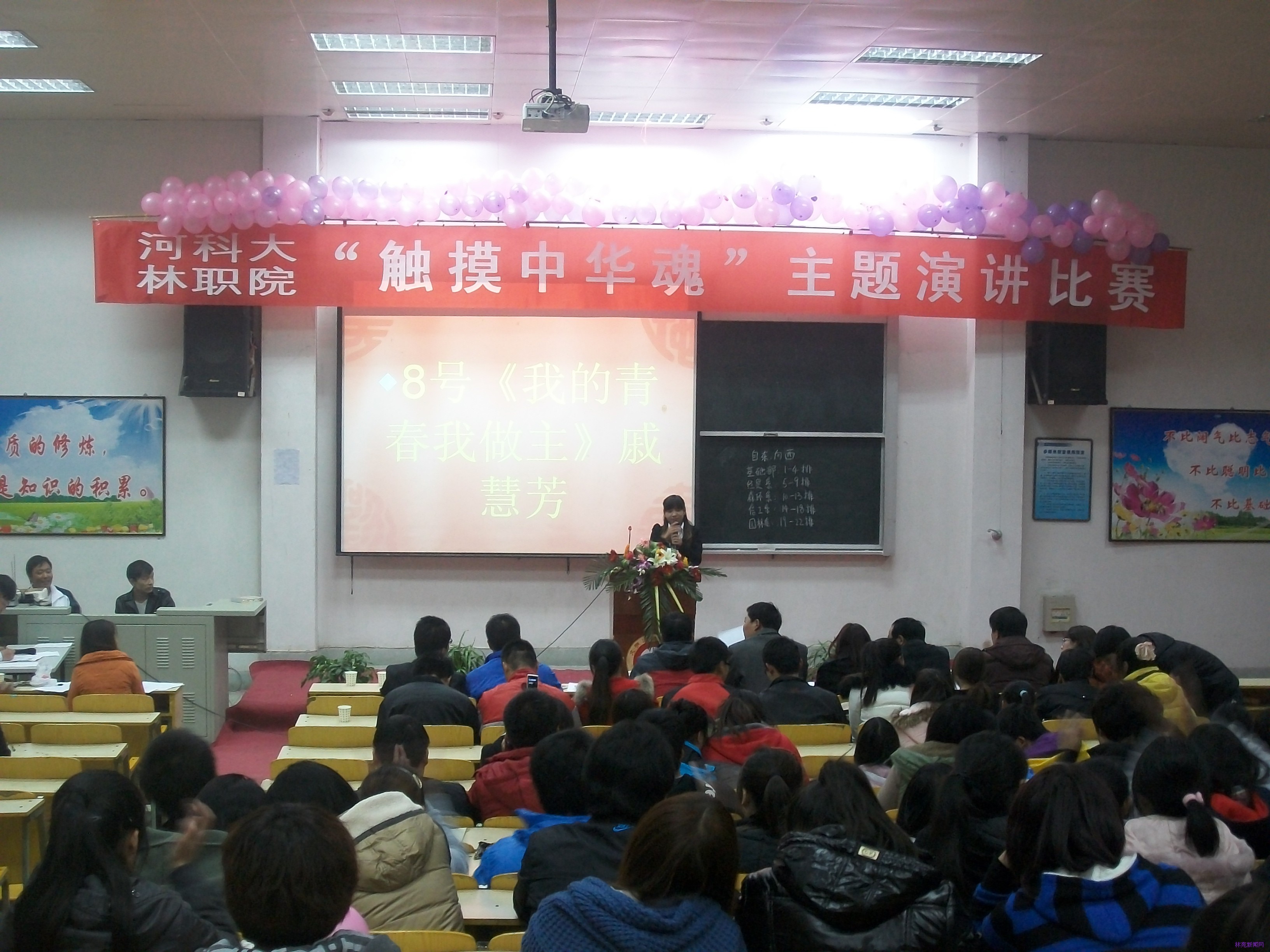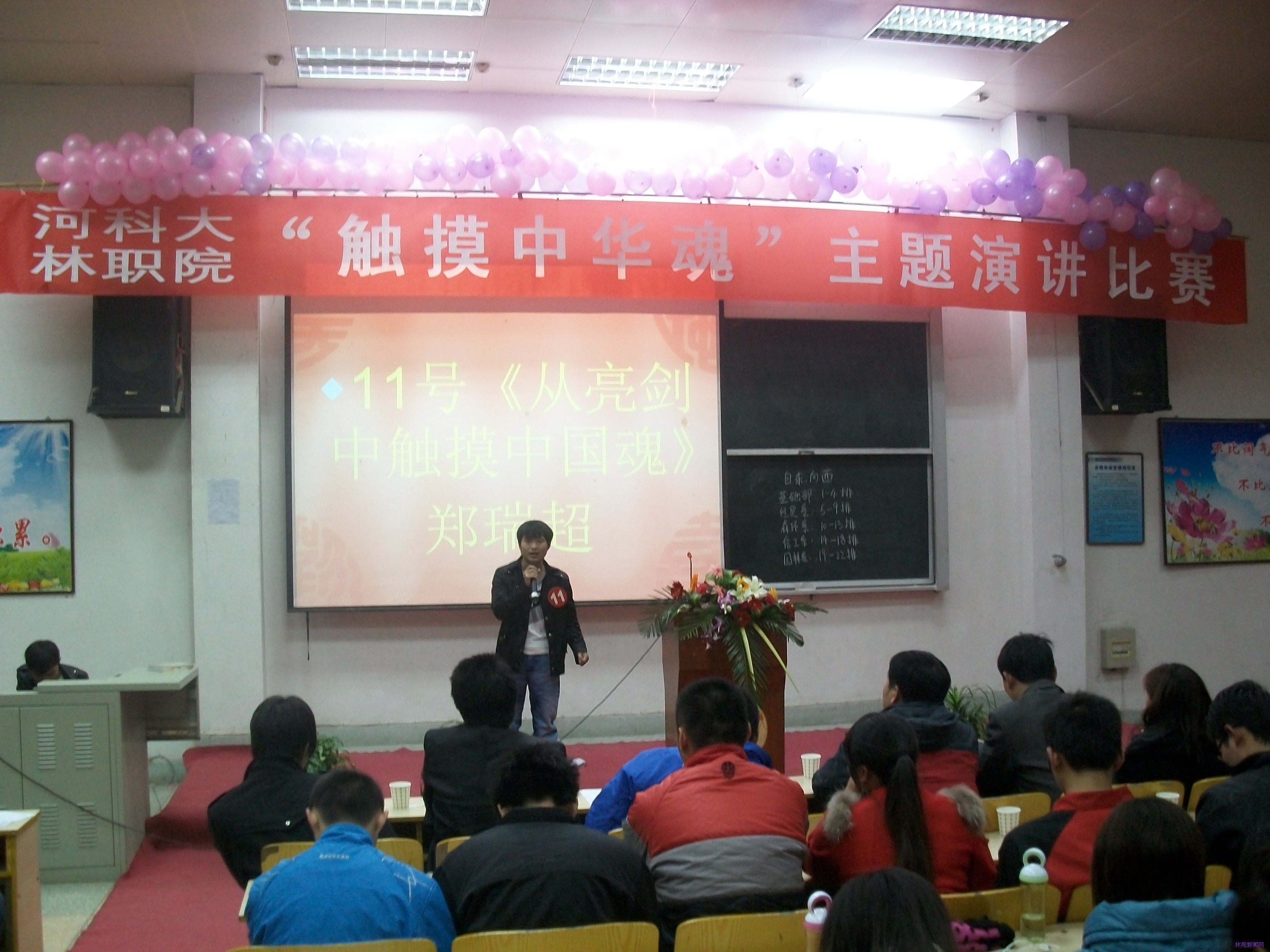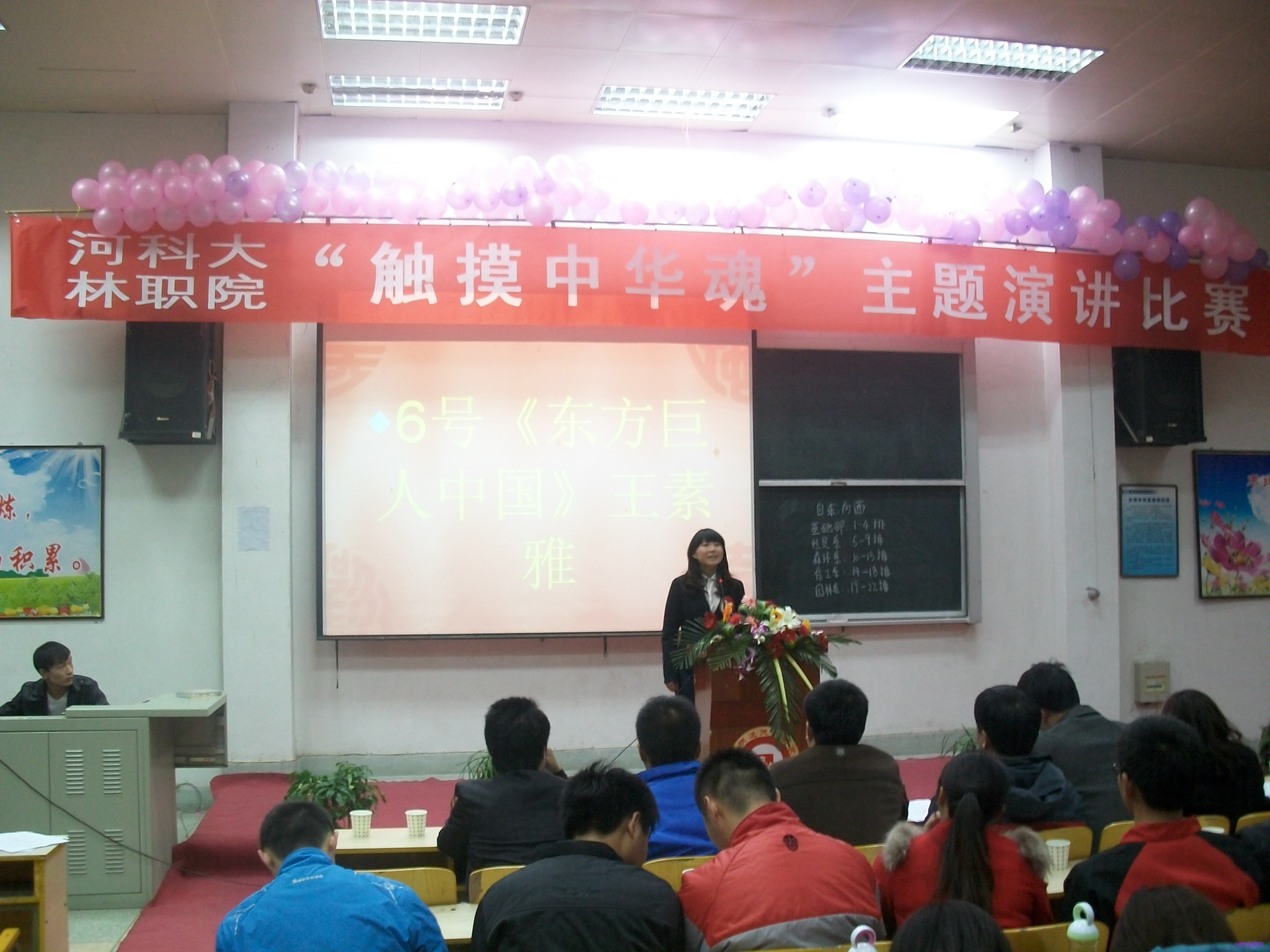 2012年11月21日晚七点,河南科技大学林业职业学院“触摸中华魂”主题演讲比赛在东阶梯成功举办。党办、学生处、团委、园林系、经贸系、森环系、政治教研室等部门负责人出席。