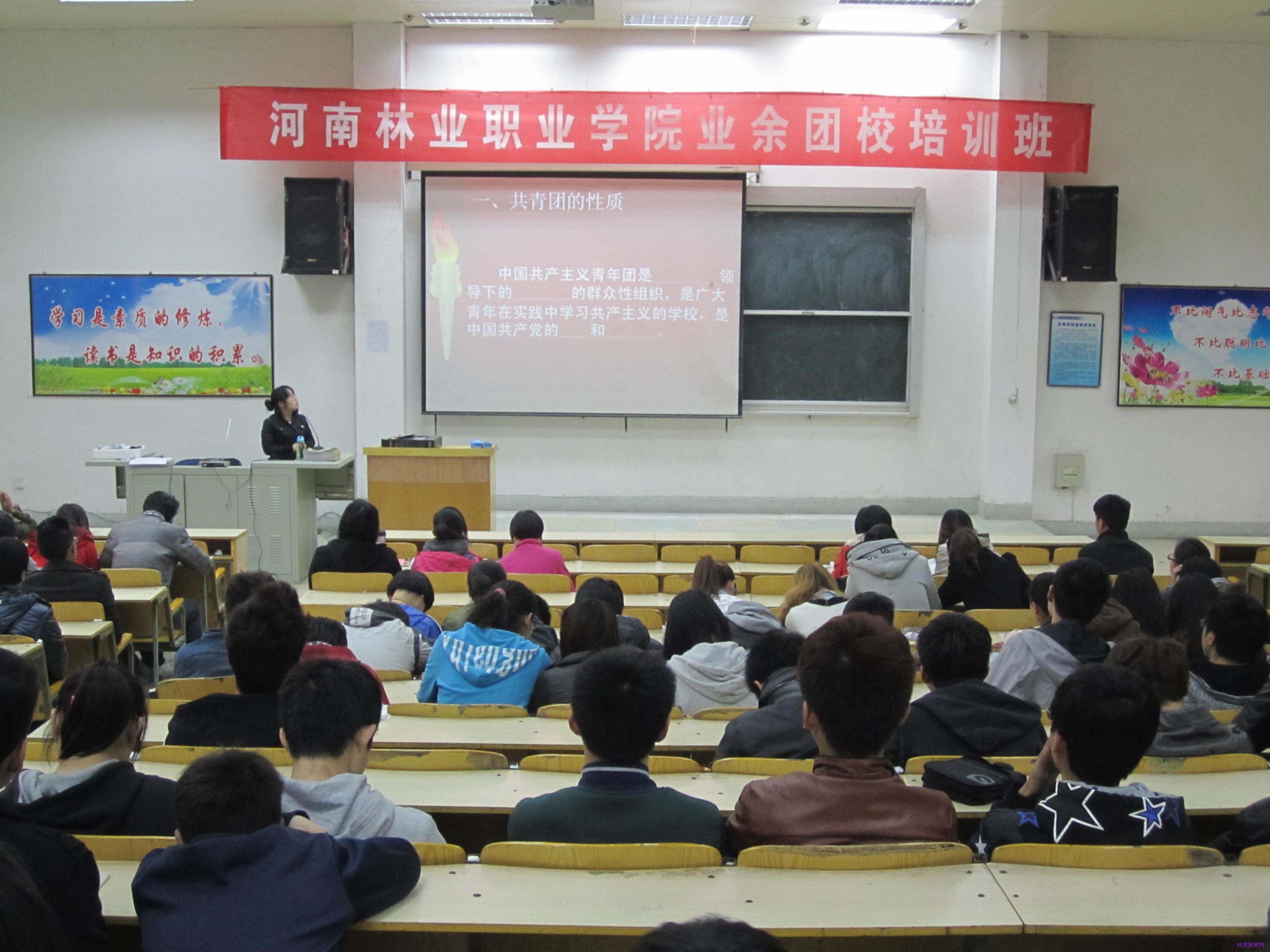 团委举办2013年业余团校培训班 作者:马丹丹 来源:团委 发布时间:2013-04-22 08:45:10 浏览次数: 次 【字体:小 大】 4月20日,院团委在东阶举办了2013年度业余团校培训班。全院入团积极分子两百余人参加了此次团课培训。培训时间为一天,培训内容共分四项。上午由园林系团总支书记徐海霞老师和经贸系团总支书记李合英老师分别作了《共青团基础知识》和《团的组织制度和工作流程》专题讲座,下午张媛老师教同学们学唱团歌,之后组织大家观看了教育影片《放牛班的春天》。学员们认真听讲、记录,积极学唱团歌,阶梯教室内气氛热烈,激昂的歌声在校园里久久回荡。 分享到: 【打印正文】