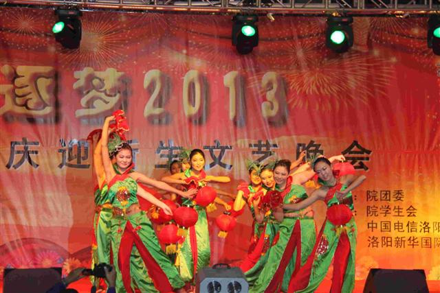 晚会在激情的摇滚乐《海阔天空》中拉开帷幕。舞蹈队的精彩表演赢得了满场彩,民族舞、现代舞、肚皮舞接连上场,冲击着观众们的视觉感官;新生高睿、尚伊凡和张晨为大家带来的B-box表演引起了全场的惊呼与赞叹;更有陈双老师的葫芦丝唯美演奏《金色的孔雀》、李志红和杨翠平老师倾情对唱《好人好梦》,向同学们展示了我院教职工才华横溢的一面;院广播站表演的配乐诗朗诵《逐梦2013》表达了青年学子在追梦过程中蓬勃向上的精神面貌。