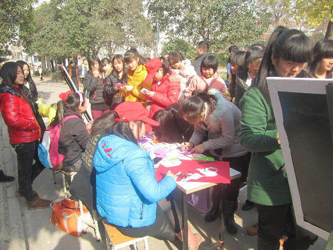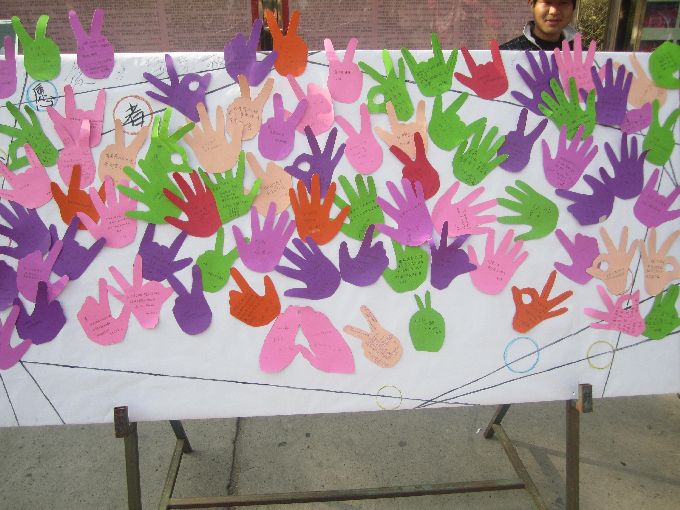 校内超市门口,一个个“小红帽”用别具趣味的活动迎接国际志愿者日。陈列的留言板上放着一个个各式各样的手掌印,手掌印上同学们祝福的话历历在目:“三年不挂科“,”xx,生日快乐”,“关心同学,关爱父母”,“队长,我们去哪儿”,“阳光下成长”等,吸引了众多同学围观参与。