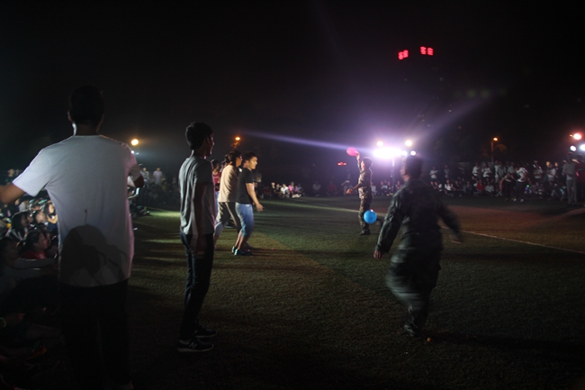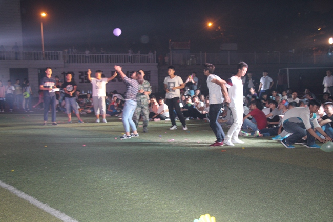 今年的中秋联欢会分三个场地同时进行,院学生会组织1-5中队在西阶梯教室开展活动,学生社团联合会组织11、12中队在大学生活动中心进行,其余11个中队则由院团委组织在运动场进行。学生们在教官的带领下热情参与,和教官一起唱歌、跳舞、做游戏、猜谜语等,气氛热烈,高潮迭起、掌声不断。组织者向新生发放了月饼和小礼物。