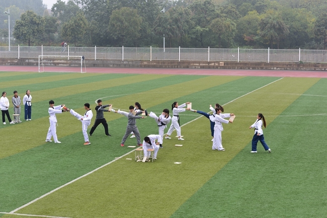 宋院长在致辞中作了激情洋溢的讲话,充分肯定了我院近年来在发展体育运动、提高全院师生整体素质方面所做的努力和成果,号召全体运动员要赛出风格,赛出水平;要求裁判员们要忠于职守,公平、公开、公正裁决;要求各班同学能遵守赛场秩序、文明观赛。裁判员代表和运动员代表分别上台宣誓。之后,院领导与师生一同观看了军体拳和跆拳道表演。