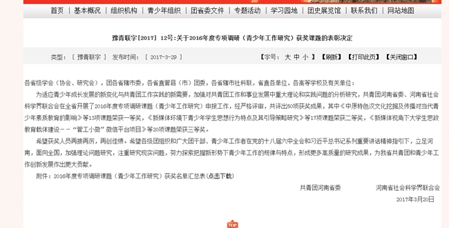 团委主持《互联网思维下高校共青团工作创新研究》课题获省级三等奖