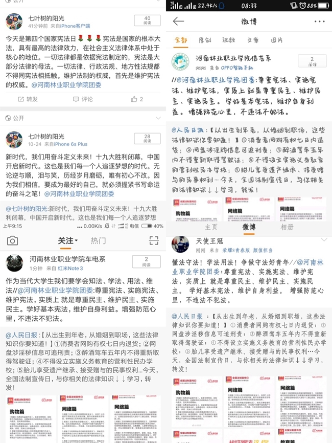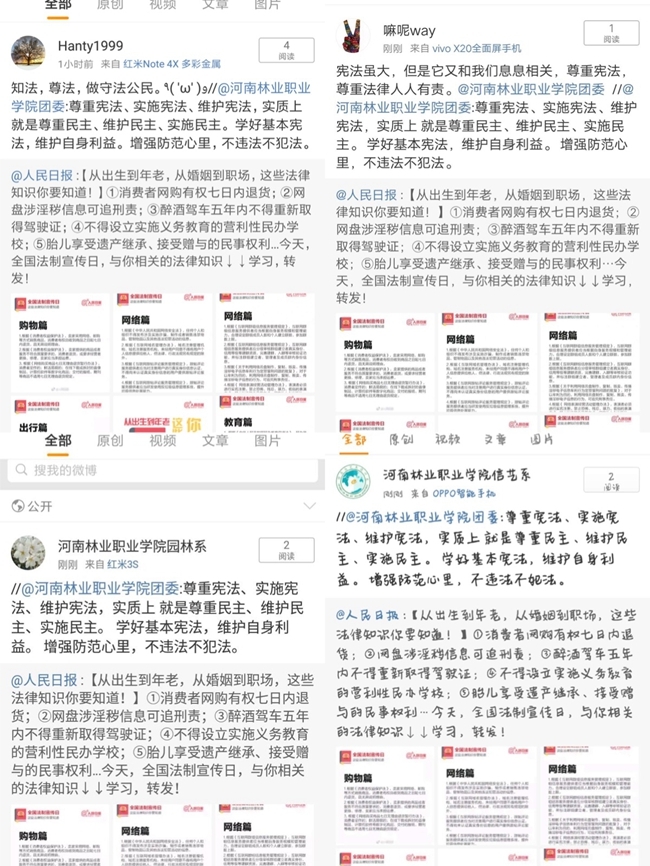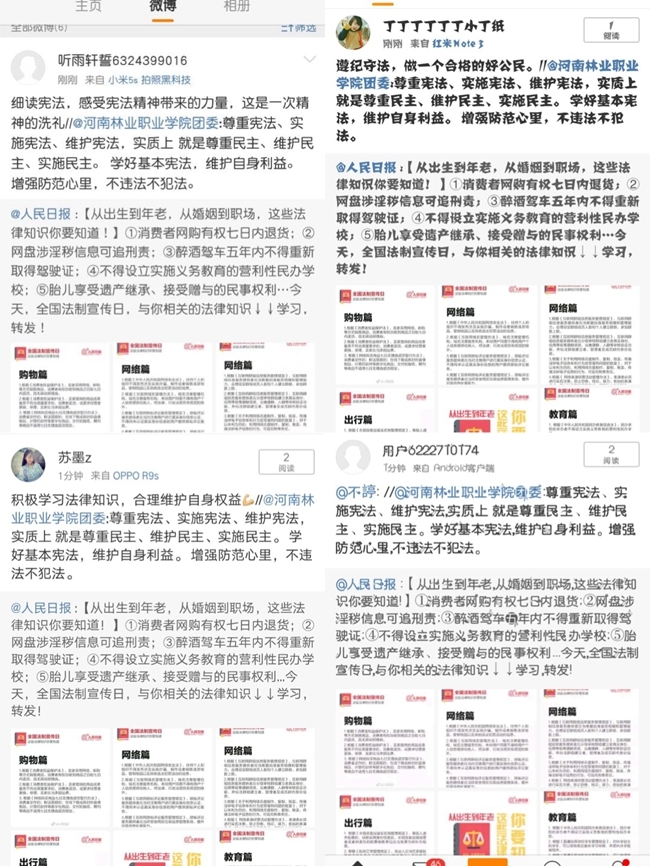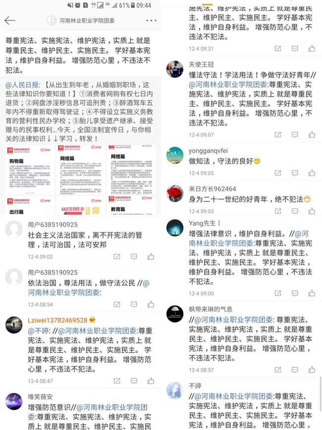 院团委开展第四个国家宪法日网络集中宣传教育活动 作者:王杰 来源:团委 发布时间:2017-12-04 14:57:33 浏览次数: 次 【字体:小 大】 2017年12月4日是第四个国家宪法日,院团委组织网络文明志愿者开展“学法、遵法、守法”网络宣传教育活动。活动一经开展,受到了广大青年学生的广泛关注和迅速参与,短短几个小时,参与微博、微信转发评论留言的数量达到数百条,展现了广大青年学生忠诚国家宪法,遵法、学法、守法的决心和意志。 分享到: 【打印正文】