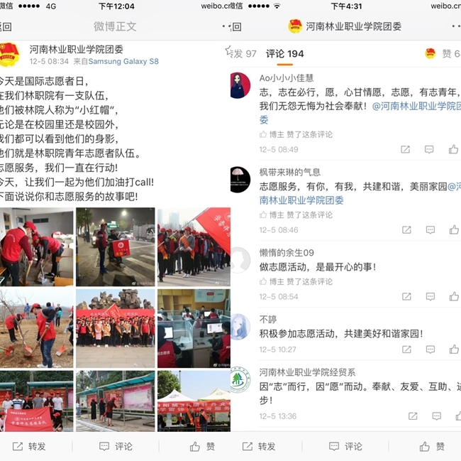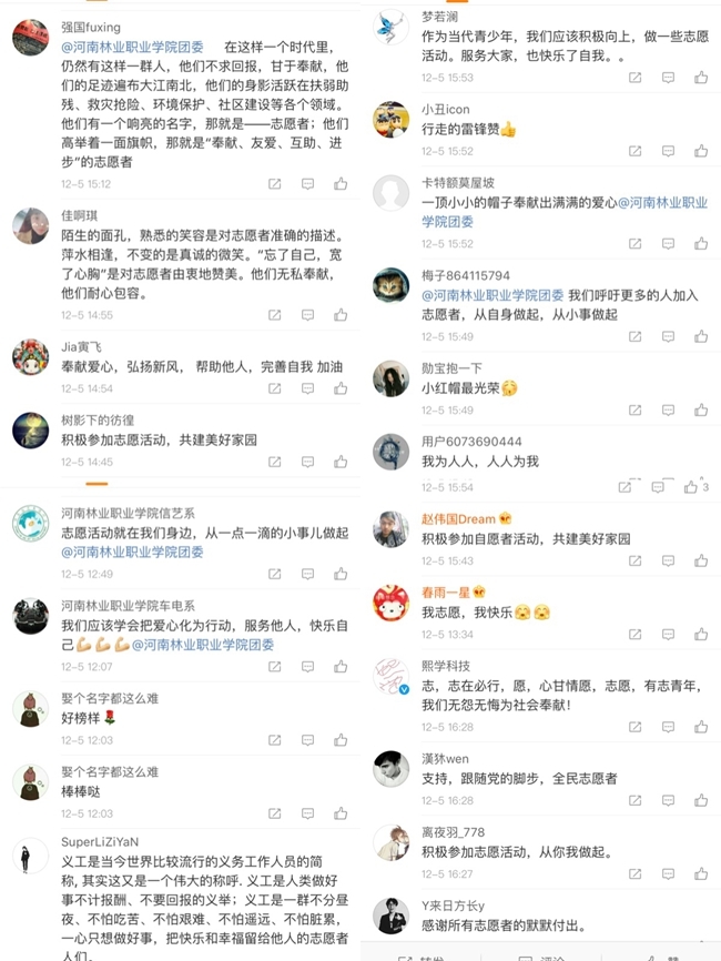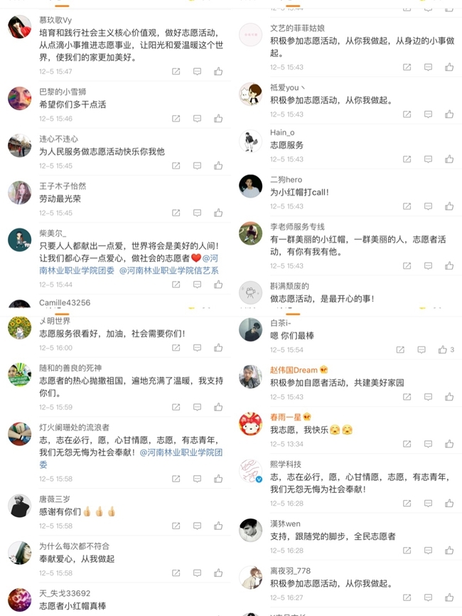 12月5日中午,各系的志愿者们牺牲午休时间,打扫植物标本园、院广场、教学楼教室及楼道卫生。除了线下的志愿活动,院团委还利用微博在线上发起“为志愿服务精神点赞”的话题讨论。同学们纷纷在网络上分享自己成为志愿者以来的感悟和收获,一时间微博上转发、跟帖、评论数量已近千条。在这个志愿者共同的节日,我院青年学生用自己的实际行动诠释了“志愿者”的内涵,大家都在用自己的实际行动为志愿精神打call,用自己的志愿服务成果为第32个国际志愿者日献礼。