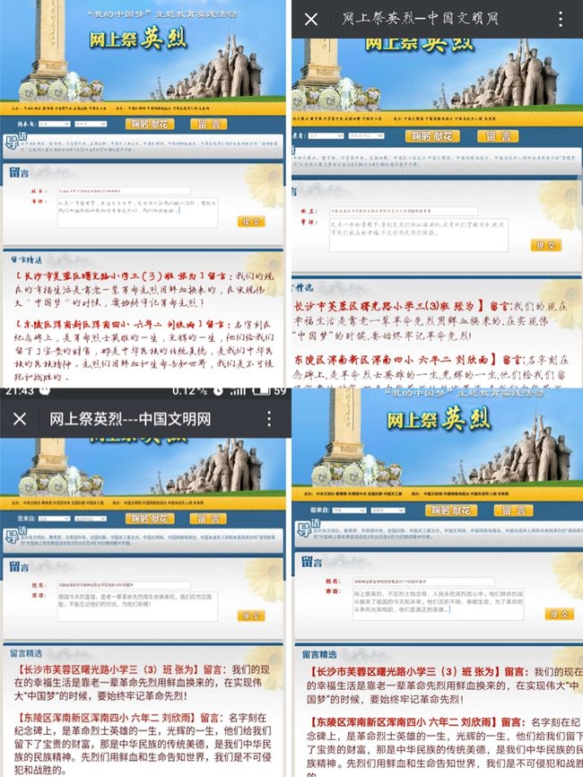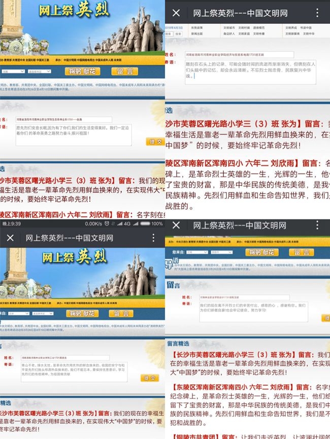 清明前夕,院团委组织网络文明促进会的志愿者们开展#清明祭英烈##请给他们一分钟#双话题微博转发评论活动。同期,网络文明促进会积极组织同学们广泛参与到中国文明网开展的“清明祭英烈,共铸中华魂”网上献花留言活动中。活动一经开展,受到了广大青年学生的广泛关注和参与,短短几个小时,参与我院团委官方微博、中国文明网转发评论留言的数量达到了数百条,同学们纷纷表示,一定会铭记革命先烈的英雄事迹,继承先烈的优良传统和革命意志,增强责任感和使命感,践行社会主义核心价值观,将个人理想追求融入到实现中国梦的共同奋斗之中。