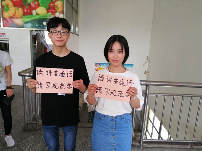 “请讲普通话 请写规范字”学生社团联合会开展规范语言文字宣传倡议活动 作者:马丹丹 来源:团委 发布时间:2018-05-16 15:18:16 浏览次数: 次 【字体:小 大】 5 月15日、16日中午,我院学生社团联合会在校内外开展了以“请讲普通话 请写规范字”为主题的宣传倡议活动,此次活动的主旨在号召师生及广大市民规范语言文字,让语言更优美,让文字更健康,让我国优秀的汉语传统文化进一步发扬光大,此举受到了广大师生和市民们的积极响应和支持。 分享到: 【打印正文】