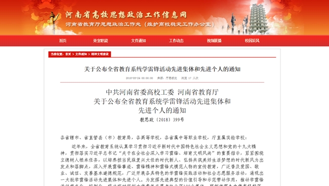 近日,省高教工委、省教育厅下文(豫教思政【2018】399号),表彰公布了2018年全省教育系统学雷锋活动先进集体和先进个人。此次表彰的全省教育系统学雷锋活动先进集体共100个,学雷锋先进个人共300名。我院青年志愿者大队被授予“河南省教育系统学雷锋活动先进集体”,团委副书记王杰、信艺系工业机器人1731班黄慧龙被授予“河南省教育系统学雷锋活动先进个人”。