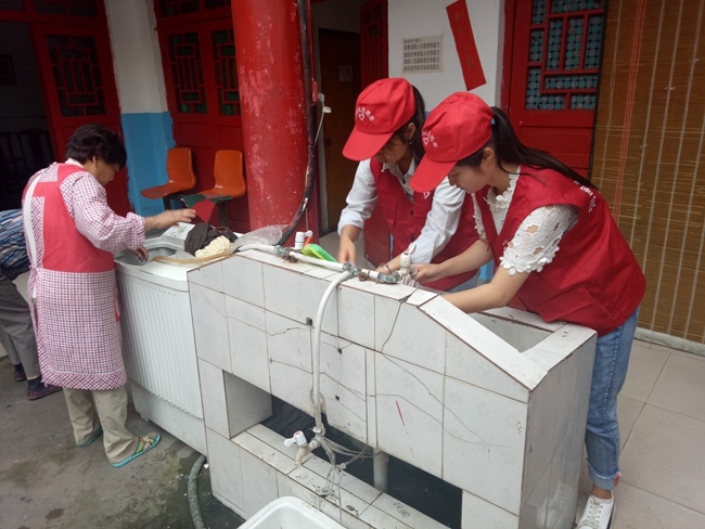 在敬老院,同学们有的帮助行动不便的老年人整理个人内务,有的帮老人们洗头擦脸,有的同学则是推着轮椅培老人们在院里散步聊天;整个上午,校园里充满了老人们和同学们的欢声笑语。