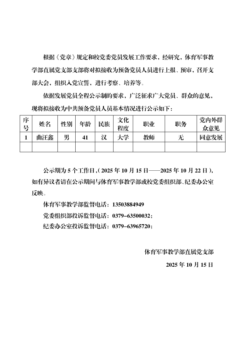 体育军事教学部直属党支部 关于拟接收为中共预备党员人员基本情况的公示 作者:体育军事教学部 来源:体育军事教学部 发布时间:2025-10-15 15:57:24 浏览次数: 次 【字体:小 大】 终审:李飞彤 分享到: 【打印正文】