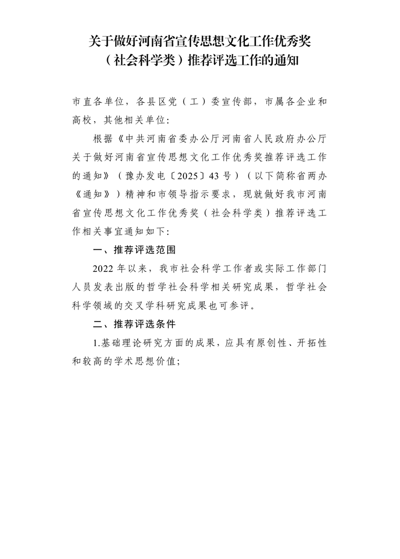 关于做好河南省宣传思想文化工作优秀奖(社会科学类)推荐评选工作的通知 作者:党委宣传部 来源:党委宣传部 发布时间:2025-11-10 浏览次数: 次 【字体:小 大】 扫一扫在手机打开当前页 【打印正文】