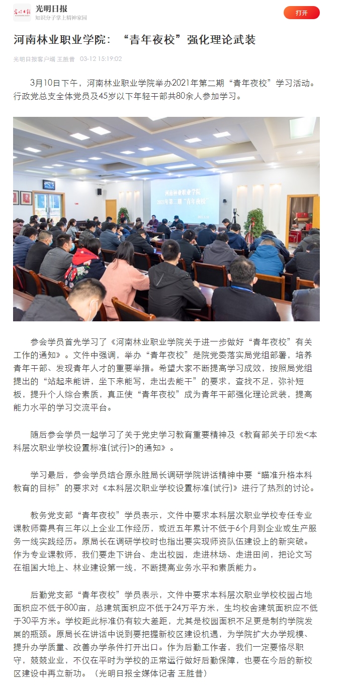 光明日报:河南林业职业学院:“青年夜校”强化理论武装