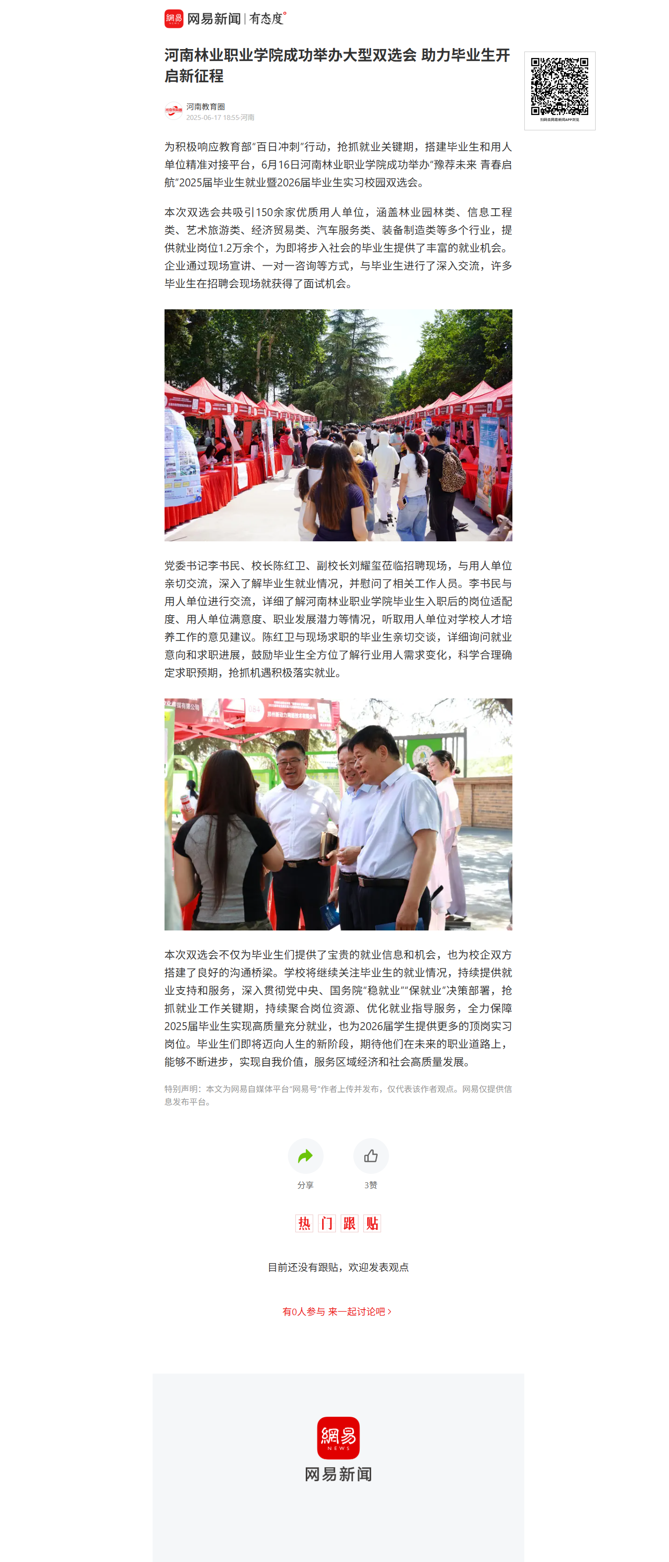 【网易新闻】河南林业职业学院成功举办大型双选会 助力毕业生开启新征程 作者:网易新闻 来源:网易新闻 发布时间:2025-06-24 15:43:14 浏览次数: 次 【字体:小 大】 分享到: 【打印正文】
