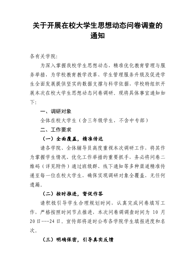关于开展在校大学生思想动态问卷调查的通知