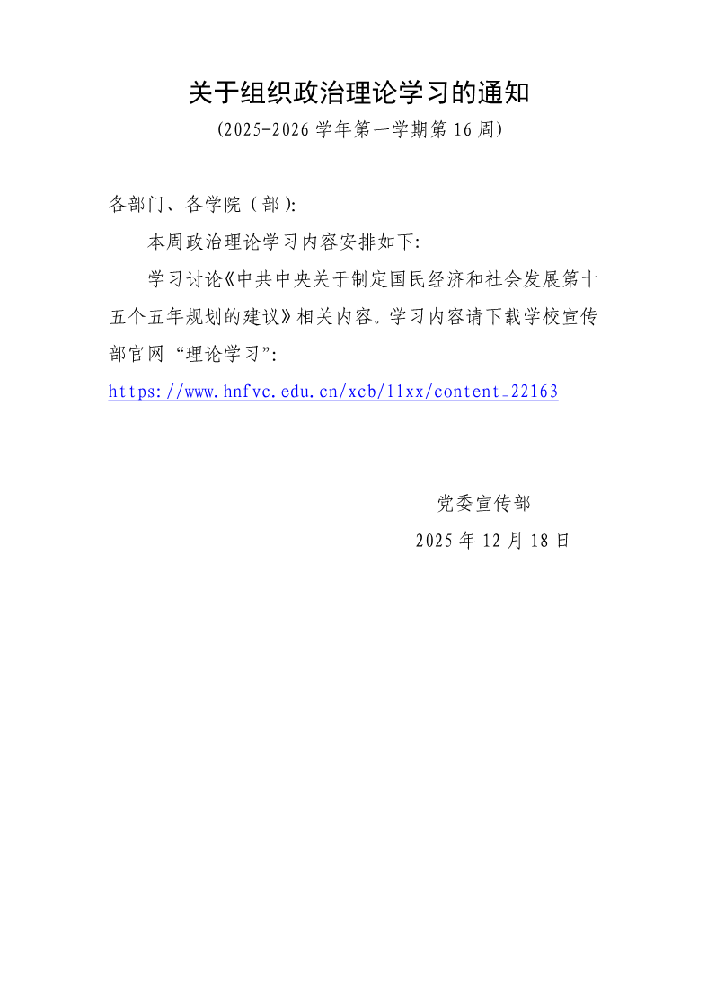 2025年政治理论学习(2025-2026学年第一学期第16周) 作者:党委宣传部 来源:党委宣传部 发布时间:2025-12-18 17:11:19 浏览次数: 次 【字体:小 大】 终审:刘瑶 分享到: 【打印正文】