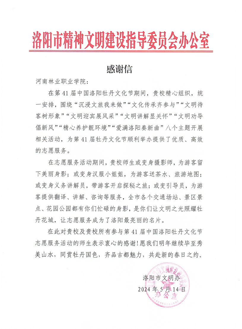 我院收到洛阳市文明办感谢信