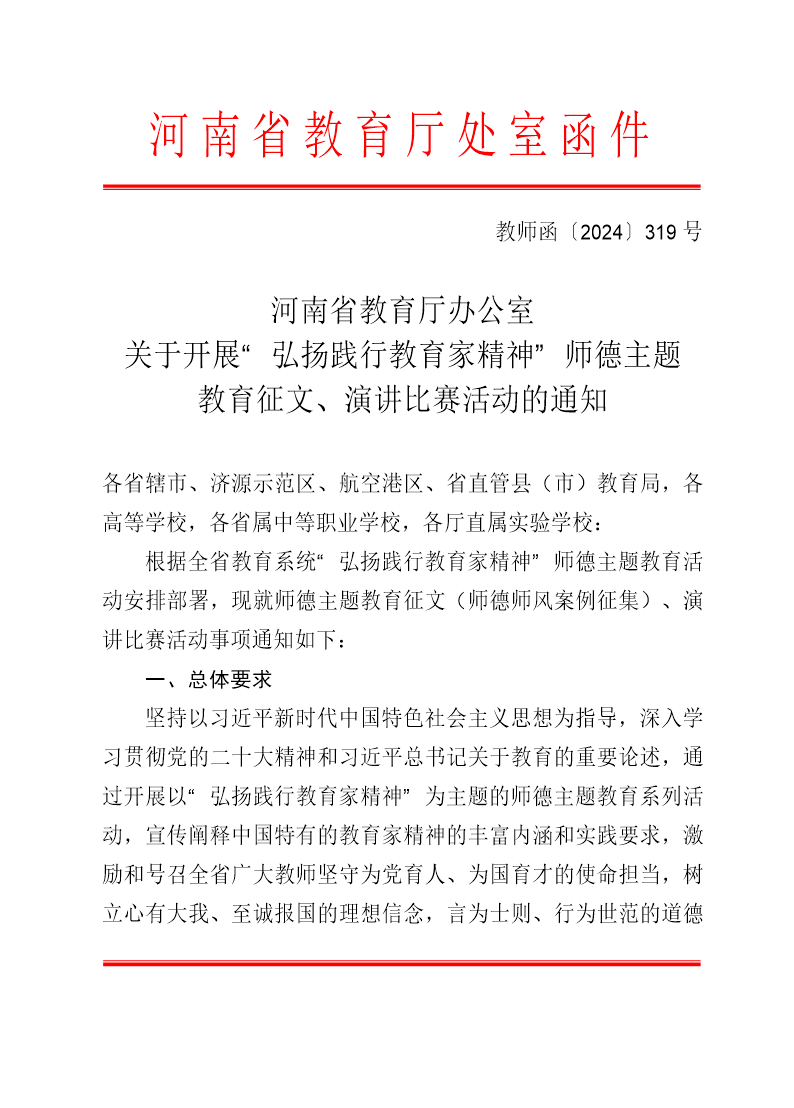 河南省教育厅办公室 关于开展“弘扬践行教育家精神”师德主题 教育征文、演讲比赛活动的通知 作者:党委宣传部 来源:党委宣传部 发布时间:2024-06-14 09:34:44 浏览次数: 次 【字体:小 大】 终审:魏金太 分享到: 【打印正文】