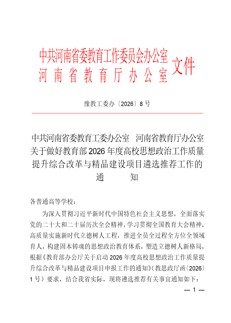 关于做好2026年度高校思想政治工作质量提升综合改革与精品建设项目申报工作的通知 作者:党委宣传部 来源:党委宣传部 发布时间:2026-02-12 10:44:43 浏览次数: 次 【字体:小 大】 2026年度高校思想政治工作研究文库(A表).doc2026年度高校思想政治工作研究文库(B表).doc2026年度高校场馆育人作用开发申报书(B表).doc2026年度高校思想政治工作案例申报书(A表).doc2026年度高校思想政治工作案例申报书(B表).doc2026年度杰出英才项目申报书(A表).docx2026年度高校思想政治工作中青年骨干申报书(A表)(2).docx2026年度高校思想政治工作中青年骨干申报书(B表)(2).docx2026年度高校国家安全教育名师申报书(A表).docx2026年度高校国家安全教育名师申报书(B表).doc2026年度学生综合素质训练基地(A表).doc2026年度学生综合素质训练基地(B表).doc2026年度高校场馆育人作用开发申报书(A表).doc2026年度全国高校综合性教育实践体验基地申报书(A表).doc2026年度全国高校综合性教育实践体验基地申报书(B表).doc2026年度高校思政工作精品项目申报书(A表).docx2026年度高校思政工作精品项目申报书(B表).docx2026年度杰出英才项目申报书(B表).docx 终审:刘瑶 分享到: 【打印正文】