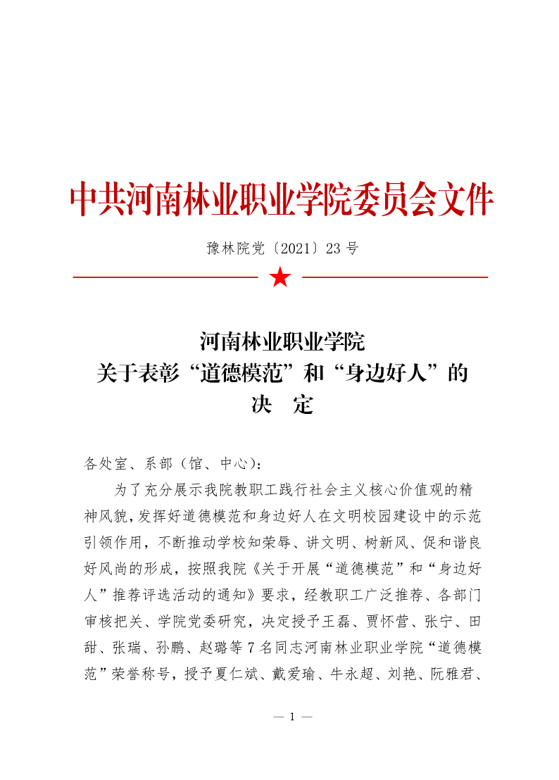 河南林业职业学院关于表彰“道德模范”和“身边好人”的决定 豫林院党〔2021〕23号 作者:工会 来源:党委办公室 发布时间:2021-10-21 浏览次数: 次 【字体:小 大】 分享到: 【打印正文】