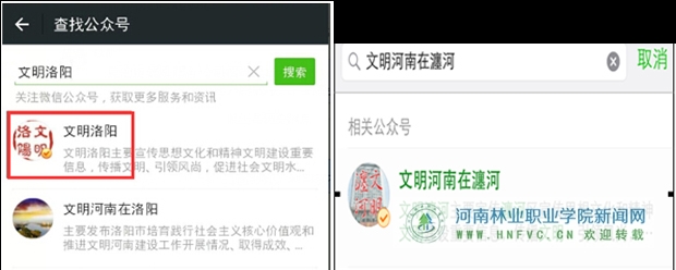 1、搜索微信公众账号“文明洛阳”、“文明河南在瀍河”(唯一认证公众账号)加关注