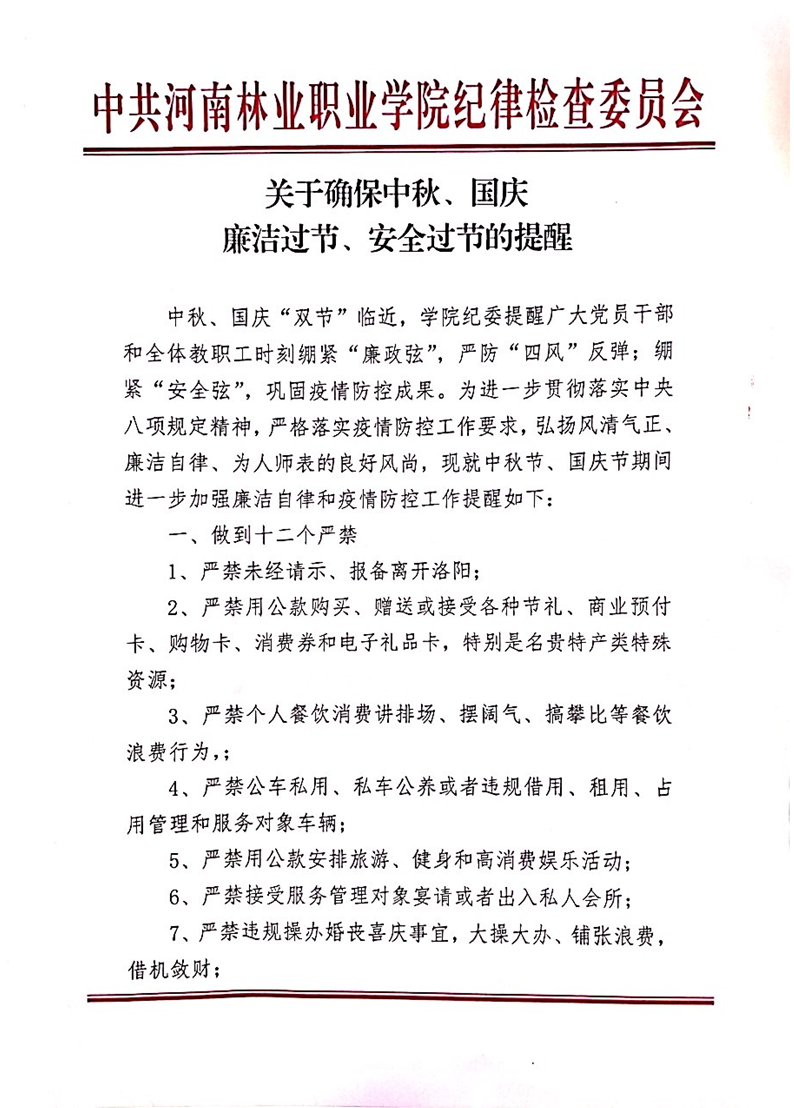 关于确保中秋、国庆廉洁过节、安全过节的提醒