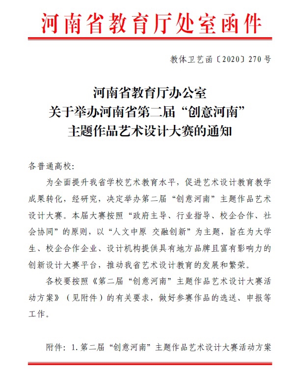 为全面提升河南省学校艺术教育水平,促进艺术设计教育教学成果转化,经研究,由河南省教育厅主办第二届“创意河南”主题作品艺术设计大赛,见《河南省教育厅办公室关于举办河南省第二届“创意河南”主题作品艺术设计大赛的通知》(〔2020〕270号)文件。本届大赛以“人文中原 交融创新”为主题,旨在为大学生、校企合作企业、设计机构提供具有地方品牌且富有影响力的创意设计大赛平台,推动大学生创新创业和我省艺术设计教育的发展和繁荣。我院信艺系艺术设计教研室从接到参赛通知后,老师们牺牲节假日时间,一边夜以继日的指导学生们设计制作,一边辛苦的创作个人作品。经过几个月的认真筹备,共提交了30多件(套)师生作品。